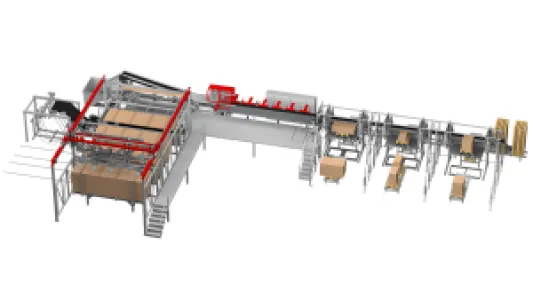 We develop stackers for the automated stacking of workpieces and use on the outfeed side of cross-cut systems. They can be employed for order picking, temporary storage or preparation of the cut pieces for transport. The cut pieces are pushed from the sorting belt onto the stacker, arranged in layers and deposited on pallets or alike. An optional stick magazine places stabilization sticks after every preset number of layers.