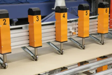 The contact-type inline thickness measurement GreCon THICKNESSCONTROL RT measures the thickness of panel materials as e.g. MDF, OSB or chipboards. The smallest plate gaps are sufficient to carry out the automatic calibration. Precise measured values are thus guaranteed at all times.