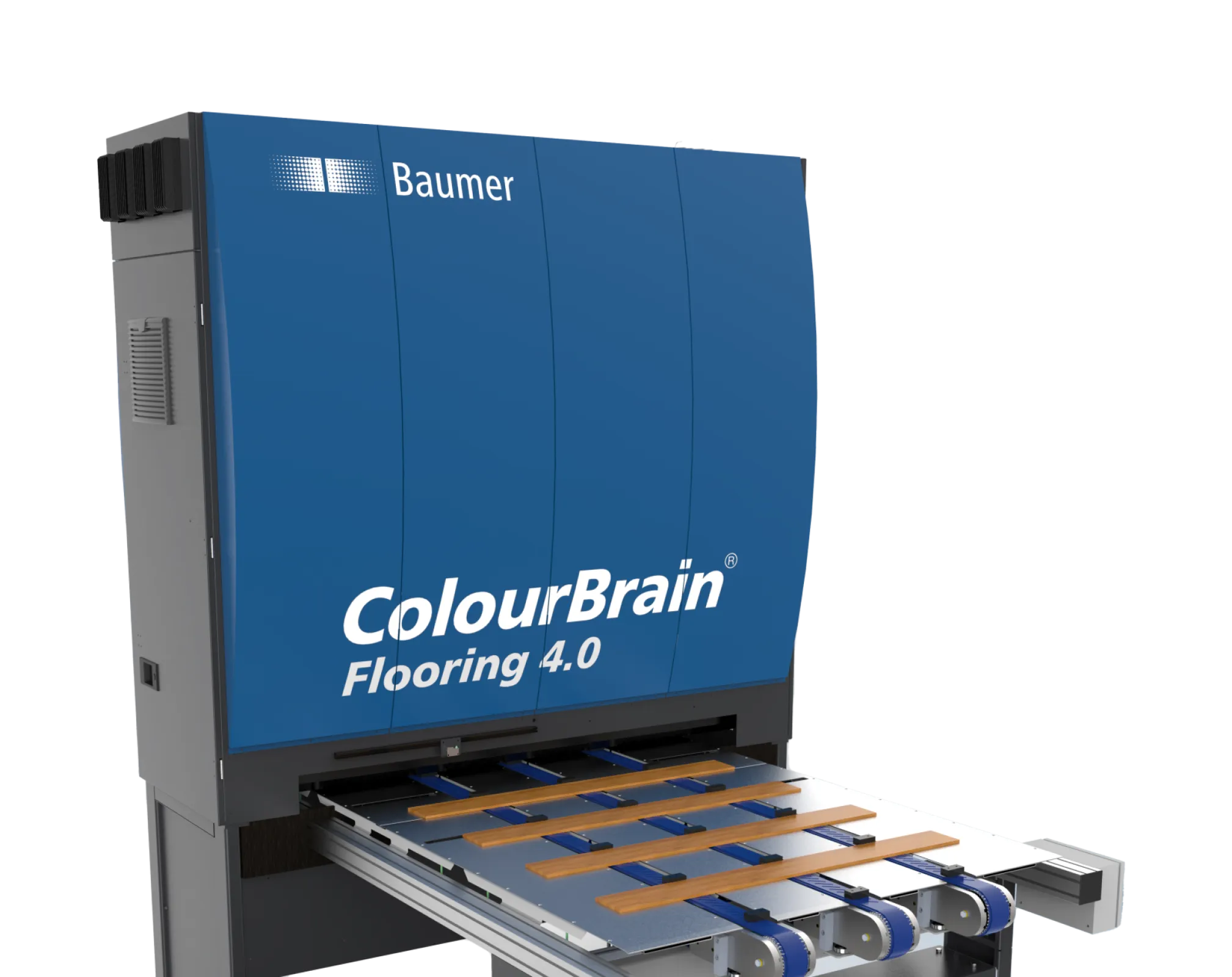 It is ideally complemented by the ColourBrain® V-Shape 4.0 systems for checking the bevel coating of the V-joint directly after coating application in the profiling line and ColourBrain® Clip for checking correct clip insertion directly after clip assembly. If defective planks are detected, they are automatically rejected before packaging.